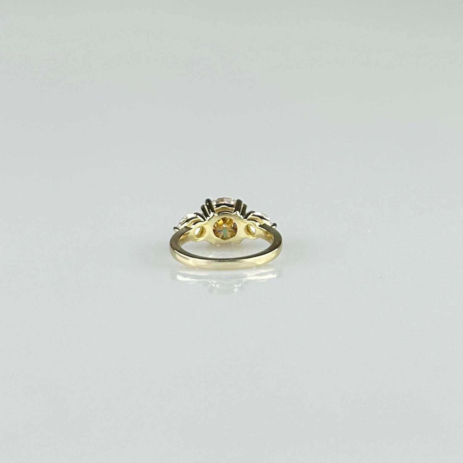 This tri-stone ring is made with a round brilliant 2 carat champagne-colored center stone with two accent stones on either side, weighing approximately .8 carats in lab grown diamond or moissanite. The double prong setting and band are 14K solid gold.